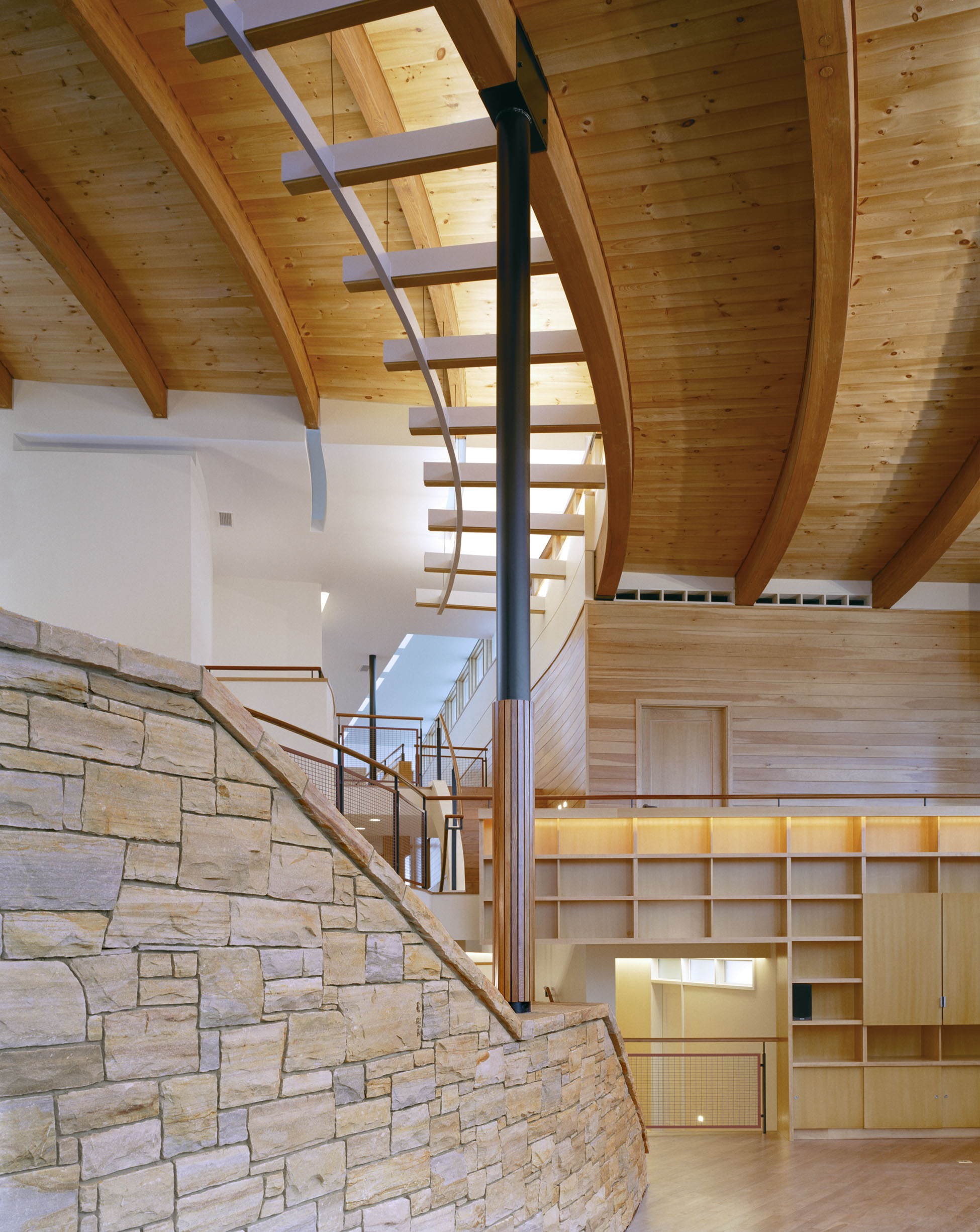 The glue laminated wood beams of this family retreat and ski lodge were inspired by technology used in the manufacture and lamination of snow skis. Located on a mountainous wooded site, the form of this 10,000 s.f. house follows the curving contour of the land providing a close fit with the hilltop while maximizing views in two directions. A terraced double height living space and 15' cantilevered roof further extend the interior of the house into the landscape.