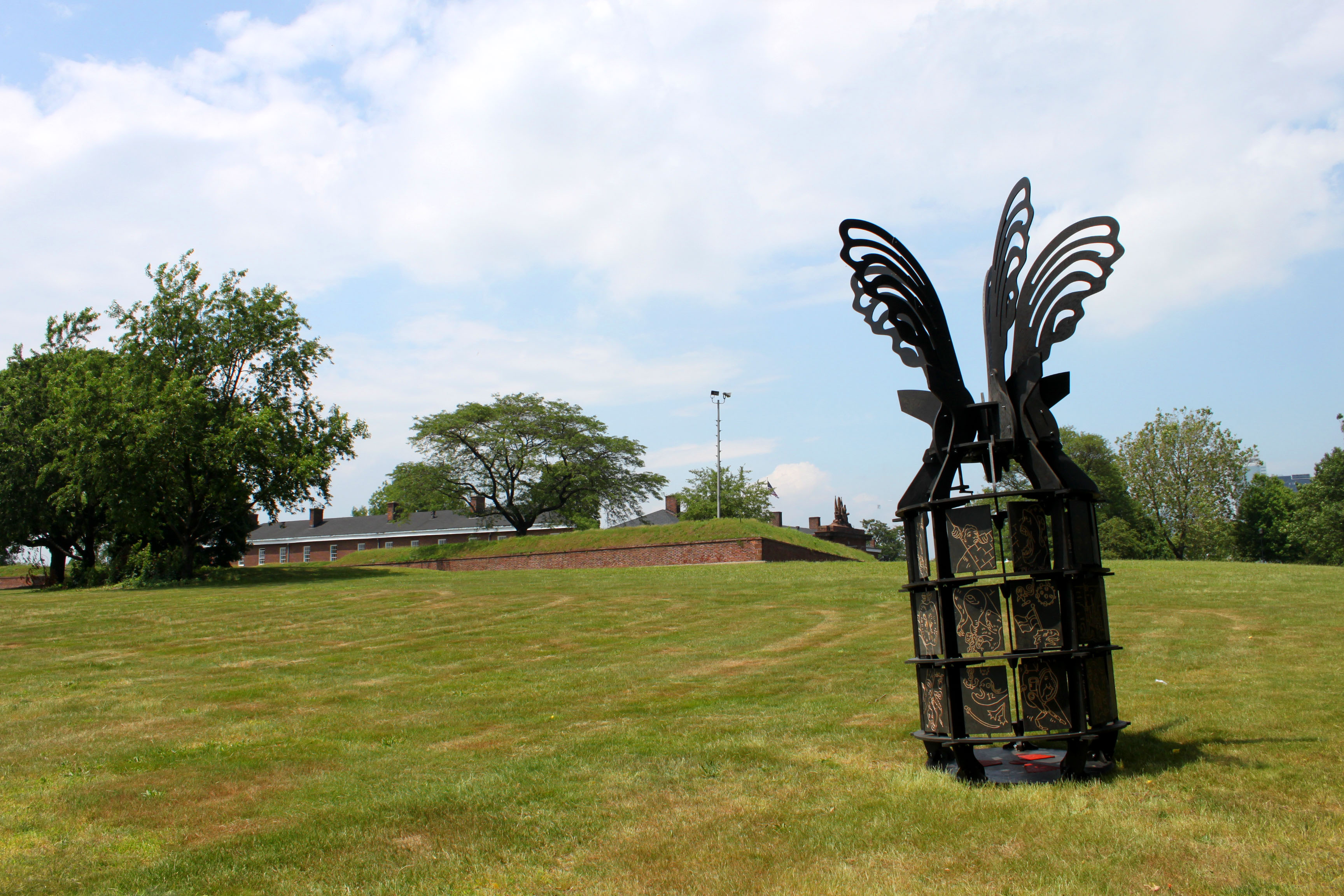 The Exquisite Weapon is an interactive installation that evokes Governor’s island’s historical and transformative nature. The piece is in the shape of an unexploded bomb, with maple seed fins. The weapon illustrates a temporary interruption in the destructive nature of creation. Its skin is composed of two-sided illustrations which evoke the dual nature of the island, its military significance and future ecological harmony. The interior of the piece allows the user to rearrange the skin’s narrative into their own preferred juxtaposition of the horror of war and an eden-like beatitude. The weapon’s tail displays a rotating teleidoscope that allows one to experience the view of a seed falling to earth or the path of a bomb bent on destruction.